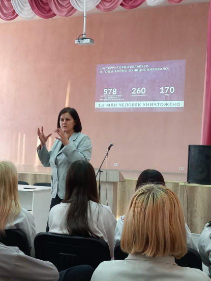 [Опубликовано: Ср 14/01/2026-12:00] 13 января 2026 года в рамках плана мероприятий, посвященных памяти жертв геноцида белорусского народа, на базе колледжа состоялась диалоговая площадка «Нельзя забыть. Нельзя понять. Нельзя оправдать». Спикером площадки выступила начальник главного управления по образованию Могилевского облисполкома Людмила Евгеньевна Здорикова. Людмила Евгеньевна рассказала ребятам о зверствах фашистов в годы Великой Отечественной войны. Учащиеся познакомились с уникальными архивными материалами времен войны, а так же с материалами в рамках расследования уголовного дела о геноциде белорусского народа.