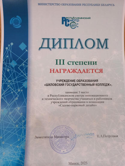 [Опубликовано: Ср 18/03/2026-10:00] В копилку колледжа добавился Диплом 3 степени по итогам Республиканского смотра инновационного и технического творчества учащихся и работников учреждений образования в номинации садово-парковый дизайн за скульптурную композицию «Учись! Работай! Созидай!».